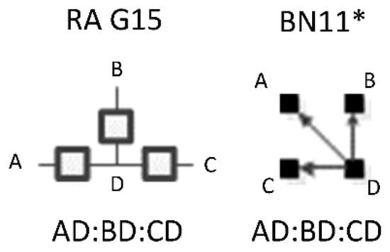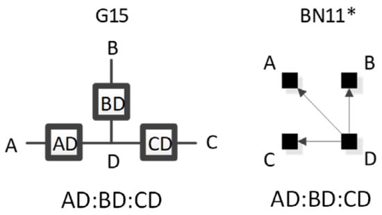 The notation that we use for BN specific graphs is derived from the RA notation described previously. As in RA, the colon represents marginal or conditional independence among variables and relations. For example, Figure 12 shows a labeled version of RA general graph G15 and BN general graph BN11* which can also equivalently be represented by BN11b, both of which have the same independencies , , the same conditional probability distribution and thus the same notation AD:BD:CD.