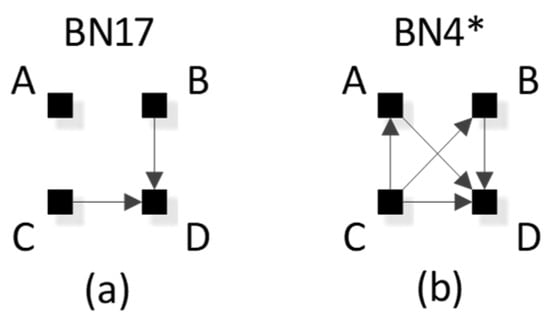 Heckerman [34] first showed that BNs with differing edge topologies can have the same independence structure and the same probability distribution, herein described as BN specific graphs. In contrast to heuristics that search all BNs, search heuristics for BN specific graphs have proven to be more efficient because they reduce the dimensionality of search space [29,31,32,40,47,48,49,50], and others. For four variables, this approach reduces the search space from 543 BNs to 185 BN specific graphs [31]. These 185 BN specific graphs can be summarized by 20 BN general graphs all with unique independence structures when variable labels are removed.