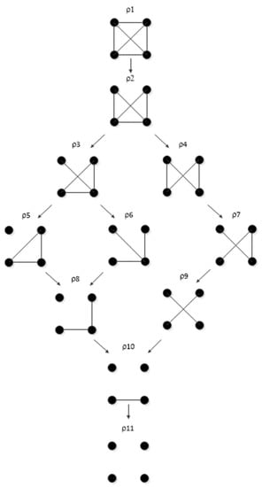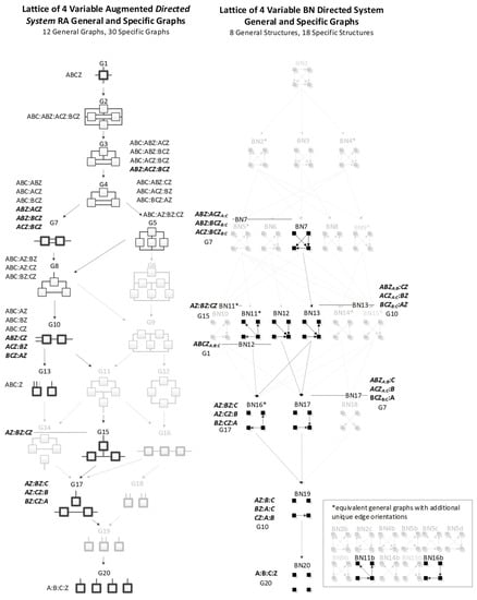 Building from the RA work of Klir [8] and Zwick [14], and the BN work of Pearl [21,22,23,51], Verma [28], Heckerman [34], Chickering [29,35,40,52,53], Andersson [31], Rubin [54], and others, the following procedure was used to generate the four variable BN general and specific graph lattice of Figure 14 in a way that can be integrated with the RA general graph lattice. While this procedure is applied in this paper to four variables, it could in principle be used for any number of variables, although of course as the number of variables increases the effort required increases exponentially.