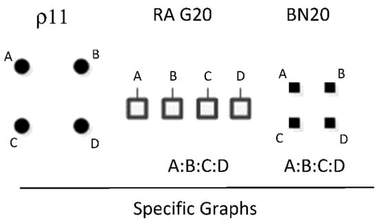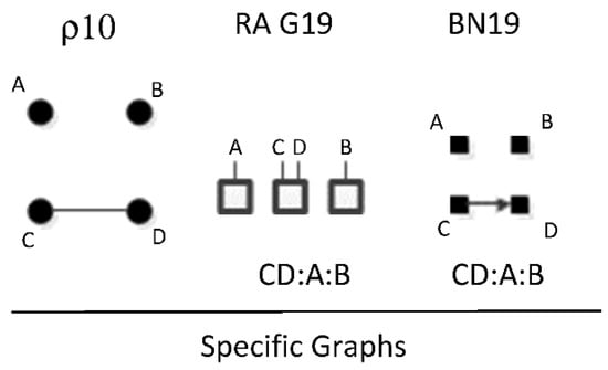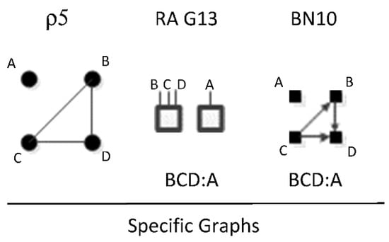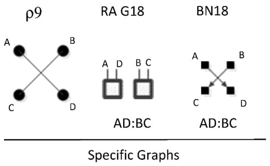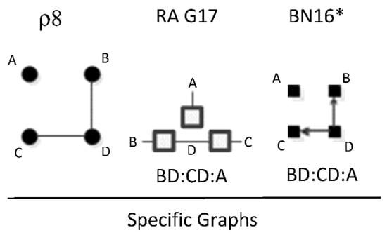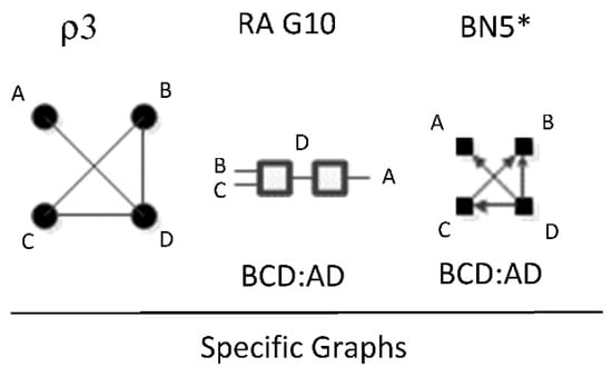 Table 1 summarizes the RA and BN terminology and supports the discussion of BN that follows. Entries in the table for RA general and specific graphs (the lattices of general and specific graphs from Figure 1 and Figure 4, respectively) have already been discussed above. The discussion that follows this table will explain the additional representations of BN general graphs in the insert of Figure 8, and will derive the lattice of specific BN graphs summarized in Figure 14 presented below in Section 3.2.5.