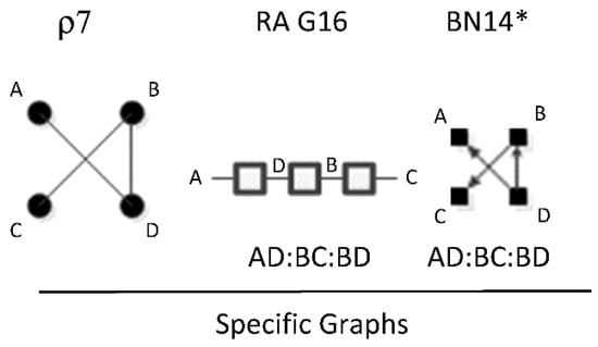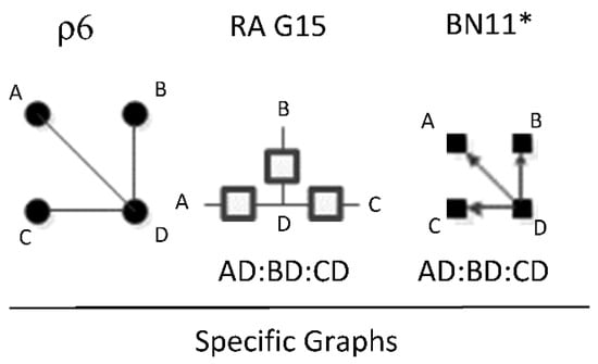 As has been repeatedly stated in the above discussion, the marginal or conditional independence between variables and relations is what uniquely specifies an RA or BN model. “It is known that the statistical meaning of any causal model can be described economically by its stratified protocol, which is a list of independence statements that completely characterize the model” [22,23,28]. The method to determine BN independencies is known as D-separation, and is described in the Appendix A.2. To determine the list of independence statements that completely describe any BN, D-separation is applied to all possible independence statements for a given BN. Those satisfying independence among variables are retained and represent the set of independencies that fully describe the structure of relations within a given BN. For four variables, Table 2 provides all possible independence statements. For a given BN, with node labels and directed edges, all independence statements from this table need to be tested. Independence statements that are satisfied are kept, and represent the set of independencies that fully describe that BN.