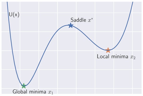 The previous work [] clarified that the Poincaré constant of the non-convex function is characterized by the negative eigenvalue of the saddle point. As shown in Figure 1, denote as the global minima, and is the local minima which has the second smallest value in . We express the saddle point with index one, i.e., there is only one negative eigenvalue at the point, between and as . This means that the eigenvalues of satisfies . Ref. [] clarified that the saddle point characterizes the Poincaré constant as