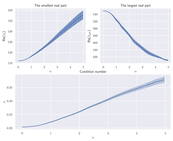 Assume that U is an m-strongly convex function, where for all , holds. Poincaré constant of LD satisfies []. For the skew acceleration, since Poincaré constant satisfies , where is the best constant that satisfies, for all x, (see Appendix D.1). Therefore, studying the Poincaré constant is equivalent to studying the smallest (real part of the) eigenvalue of the Hessian matrix. Thus, the relation between and must be studied. The following theorem describes how the skew matrices change the smallest eigenvalue.