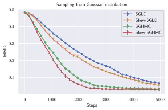 where is an auxiliary random variable, is a positive constant, and is the variance of the stationary distribution of auxiliary random variable V. The stationary distribution is , where denotes a Gaussian distribution. The superior performance of ULD compared with LD has been studied rigorously [,,]. ULD’s convergence speed is also characterized by the Poincaré constant []. In practice, we use discretization and the stochastic gradient for ULD, which is called the stochastic gradient Hamilton Monte Carlo (SGHMC) []. The second non-reversible dynamics is the skew acceleration given as