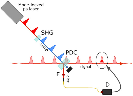 In order to remotely prepare a pure single photon state in the signal mode [17,18], idler photons undergo narrow spatial and frequency filtering (F) by passing through etalon interference filters and coupling into a single-spatial-mode fiber before detection by an on–off avalanche photodetector (D). In fact, the remotely prepared signal state only approaches a pure state if the filter transmission function is much narrower than the momentum and spectral widths of the pump [19,20,21,22].