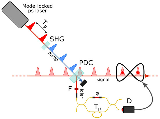 The first superposition of multimode single-photon addition operations was realized by our group in 2006 [29]. Since its first demonstration, this experimental approach has been used in several different contexts and with different combinations of light states in the input modes. The particular scheme takes advantage of the pulsed operation of our main mode-locked laser source to remotely implement the coherent superposition of two photon addition operations on different traveling wavepacket temporal modes. Basically, the photon addition scheme described in Figure 1 is complemented by the introduction of an interferometer in the idler arm that allows the herald photons to travel paths of different length to reach the on–off photodetector, as shown in Figure 2. An idler photon detected by D may thus have been generated by either of two successive pump pulses, provided that the time delay between the short and long arms of the interferometer is chosen equal to the time separation between two successive pump pulses.