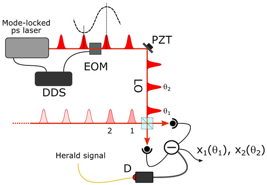 If the state occupies two (or more) temporal modes, a multimode extension of the above scheme is necessary [34]. In this case, a single herald click event triggers the acquisition of several consecutive difference photocurrent pulses and the corresponding quadrature data points are obtained by integrating over each mode of interest. Due to the relatively long temporal coherence of the mode-locked laser providing the LO pulse train, many successive LO pulses share essentially the same phase. However, for a full tomographic analysis and reconstruction of a multimode signal state, the phase of the LO pulses corresponding to the different i modes should, in principle, be individually controlled and adjusted. In the two-mode case, we independently changed the phases of the two LO pulses in the interval by controlling their global phase via a piezo-mounted mirror and their relative phase by means of a fast electro-optic modulator (EOM), as shown in Figure 3. An ultraprecise timing system, based on a direct digital synthesizer (DDS), was used to generate the modulator driving signal, which is locked to the laser pulses, and synchronize the rest of the acquisition system.