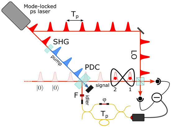 which is normalized under the condition . The reconstruction of its density matrix requires that, for each click in the herald on–off photodetector, one performs a homodyne measurement composed of a pair of quadrature values , with the phases and defined by the phases of local oscillator pulses at temporal modes 1 and 2. In principle, one should acquire quadrature measurements while performing a full scan of the two phases and independently. However, one can easily demonstrate that, as long as one of the states in the two input modes is a Fock state, the two-mode quadrature probability distributions only depend on the LO phase and the sum of the LO phase in the first mode and the superposition phase , whose roles are thus interchangeable. Therefore, for the class of states including that of Equation (4), it is possible to perform quantum tomography by using a common local oscillator phase for the two modes () and varying the state superposition phase , instead of keeping the state fixed and scanning the two LO phases during the homodyne acquisition (see the Supplementary Materials of [43]). This property makes the experimental setup particularly simple, as any two consecutive equal-phase pulses coming from the mode-locked train can be directly used as LO pulses while remotely varying the phase by means of the interferometer in the idler channel. Moreover, since the simple one-photon state of Equation (4) is invariant with respect to global phase shifts, one does not even need to control and stabilize the global LO phase with the piezo-mounted mirror.
