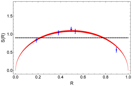 Experimental values (blue dots) of the entanglement witness in Equation (6), as a function of the superposition weight R, measured on the states of Equation (4). The black dashed line is the theoretical threshold above which detects entanglement. Experimental values larger than this threshold certify the presence of entanglement in the state, whereas values below it cannot reveal any information about this property. The red area represents the theoretical behavior of the witness calculated on the states of Equation (4), considering fluctuations in the detection efficiency during the measurements.