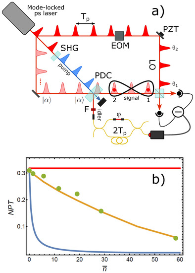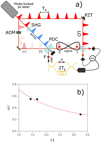 by varying the reflectivity of the first interferometer beam-splitter according to the amplitude of the input coherent state. In the experiment, schematically illustrated in Figure 6a [49], this is achieved by adjusting a variable-ratio fiber coupler at the input of the interferometer so as to equalize the idler count rates from each of the two interferometer arms.