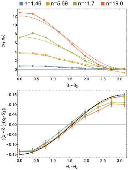 As expected from the theoretical dashed lines also reported in the figure, the quadratures in the two modes are positively correlated, with a strength increasing with , for , while such a positive correlation reaches its minimum value when . On the contrary, the removal of the mean field contribution from the quadrature data before calculating their product has the result of going back to the simple situation of a path-entangled single photon. In this case, a clear anti-correlation in the two modes is present for , whereas the quadratures are uncorrelated or positively correlated for or , respectively.