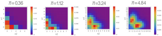 The joint photon number distributions obtained from experimentally reconstructed density matrices without correction for detection efficiency are shown in Figure 9 for different amplitudes of the input coherent states. Although the experimental distributions do not exhibit a perfectly null diagonal due to experimental imperfections (limited detection efficiency and imperfect delocalized photon addition operation), they nevertheless present an evident decrease in the magnitude of the diagonal elements, a clear signature of discorrelation.