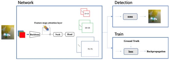 An algorithm based on FMA-YOLOv5 was designed to implement the real-time floating debris detection in this paper. The algorithm is composed of two processes: network training and detection, as shown in Figure 1. The weight parameters of the model are continuously updated by the loss of backpropagation in the training process. The weight value of the model does not change during detection. The prediction value is filtered according to the threshold value, and the final detection result is selected and marked on the image.