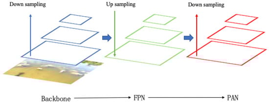 The training and detection network of this algorithm adopts the YOLOv5 network structure, as shown in Figure 2. The backbone part of the network is Cross Stage Partial Network (CSPNet) [34]. CSPNet alleviates the problem that requires a lot of inference calculations. CSPNet divides the feature map of the base layer into two parts and then extracts the image features by merging the cross-stage hierarchical structure. The advantage of this method is that it reduces the repeated gradient information, decreases the amount of calculation, improves the calculation speed of the equipment and does not affect the accuracy of the model. In order to make full use of the feature information extracted from different layers, YOLOv5 also adopts the network structure of feature pyramid networks (FPN) [35]. The feature maps of different levels obtained from the downsampling of the input image are then processed in upsampling from top to bottom, and the new feature map is obtained by splicing with the original feature map on the left. This structure not only enriches the scale of the output feature map but also achieves a better effect by combining shallow information with deep information. After the FPN feature combination, the path aggregation network(PAN) [36] structure is added on this basis. After convolution downsampling, the combined bottom feature map is spliced with the same scale feature map in the left FPN structure, and finally, three output feature maps with different scales are obtained. The purpose of this combination is to convey strong location features from the bottom up and increase the accuracy of the model’s feature extraction.