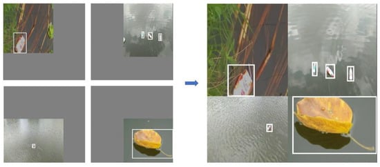 The effect of mosaic data augmentation processing of this algorithm is shown in Figure 4. The advantage is that, firstly, it is equivalent to increasing the number of training images each time, which is conducive to saving the GPU memory of the training equipment and also increases the number of images in each batch; secondly, it is conducive to the training model’s ability to detect small targets. The target object in each image becomes smaller than the whole image by splicing four images into one. This method is helpful to improve the model’s ability to detect smaller targets in the waterway.
