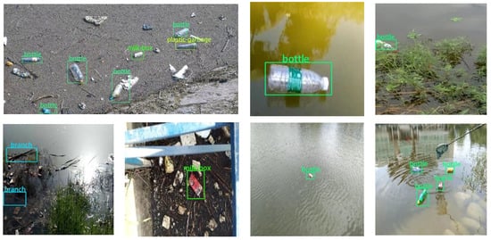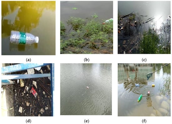 In order to realize the real-time detection of the floating debris in the river environment, the data required for modeling are collected in the actual river channel. The specific image data include the following situations, as shown in Figure 5: water grass or other facilities block a part of the monitoring target, strong sunlight reflection near the floating objects, complex water surface of the river, too small target in the image, ripple near the target, etc. The above situations are difficult examples in the monitoring of floating debris, and adding such images can improve the robustness of the model.