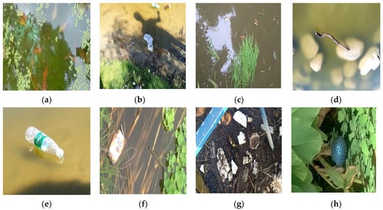 Floating debris category: (a) leaf; (b) plastic-bags; (c) grass; (d) branch; (e) bottle; (f) milk box; (g) plastic garbage; (h) ball.