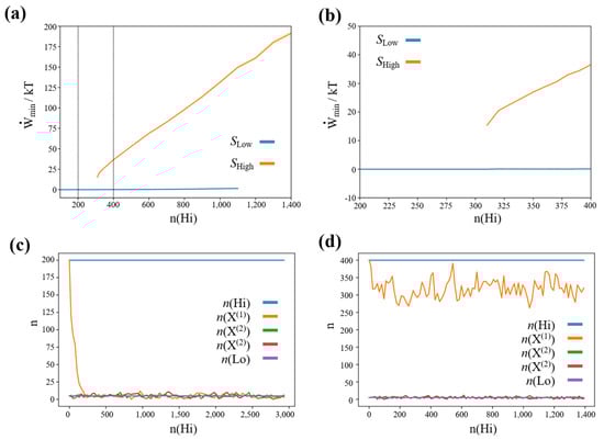 (a,b) Minimum work-rate (equivalent to a minimum concentration difference , where ) required to maintain stable nonequilibrium, high-concentration states in a stochastic chemical reaction network featuring winner-take-all dynamics. : Low-concentration steady state, : High-concentration steady state. (c) Representative simulation trajectory for . (d) Representative simulation trajectory for .