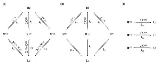 We now can construct the chemical reaction network evincing the selection mechanism that we want to discuss in this paper: We use the same winner-take-all attractor motif; however, we do not directly connect ,, and to the clamped high-concentration species , but rather to a dynamic reservoir species , as shown in Figure 3a. Next, we introduce three potential relaxation channels, allowing the conversion of a molecule of the clamped, high-concentration species to a molecule of the clamped low-concentration species via three possible intermediate species, ,, and . Crucially, we make the synthesis of these intermediary species dependent on catalysis by two molecules of ,, or , respectively, as shown in Figure 3b. Finally, we couple the maintenance of the high-concentration winner-take-all attractor states to the conducted free energy flow, via a bifurcation process, turning a molecule of ,, or into a molecule of the reservoir species . Again, we make these reactions depending on two molecules of ,, or , respectively, as shown in Figure 3c.