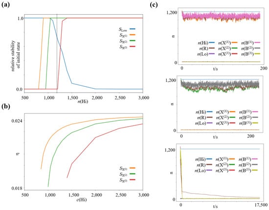 Increasing selection pressure on the efficiency of the work-harvesting processes maintaining the dissipative nonequilibrium steady states with decreasing available chemical potential difference. (a) Relative stability of the low and high-concentration steady states as function of , where (b) Efficiency of the bifurcation processes at the individual high-concentration nonequilibrium steady states of species X(1), X(2), and X(3) as function of , where (c) Representative trajectories of a chemical reaction network initialized close to each high-concentration steady state for . : high-concentration state of species X(1), : high-concentration state of species X(2), : high-concentration state of species X(3), : Low-concentration steady state.