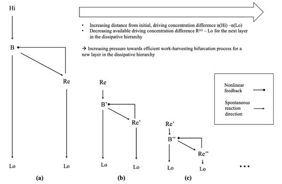 The steady state concentration gradient , which is required to sustain the dissipative fluxes between and in our simulated network, constitutes a disequilibrium by itself. This disequilibrium can drive the emergence of another layer of dissipative systems with a similar structure. For example, one could just add another winner-take-all dissipation motif in a hierarchical fashion, as shown in Figure 5. Due to the construction of our reaction network, the concentration gradient and the associated chemical potential difference will be smaller than that of the initial, driving disequilibrium . Furthermore, assuming a similar architecture of the “higher order” winner-take-all network, including the reaction rate constants, the minimum work-rate required to maintain the corresponding nonequilibrium steady state will be similar to that of the original dissipative structure. Thus, there is already a slight increase in the minimum efficiency of the new bifurcation process required to harvest enough work to maintain the additional layer of dissipative structures. Given a sufficiently complex chemical space, one might imagine another layer of dissipative processes, feeding on the structure afforded by the second order winner-take-all network, e.g., in terms of the concentration gradient , where . Thus, by iterating this argument over additional, self-similar layers of higher order dissipative structures—each feeding on the structures afforded by the previous layer of dissipative structures—an increasing pressure towards efficient bifurcation processes would develop as one moved further away from the initial, driving disequilibrium in this dissipative hierarchy. In this setting, a new layer of dissipative structure could only form if the associated work-harvesting bifurcation process were efficient enough to sustain it. As the available driving concentration gradient would monotonically decrease with each new layer of dissipative structures, but the minimum work required to sustain each successive layer would not, one could expect to find highly efficient, close to optimal dissipative structures in higher levels of this dissipative hierarchy—given a sufficiently complex chemical space and enough time for the chemical network to discover these highly efficient nonequilibrium steady states.