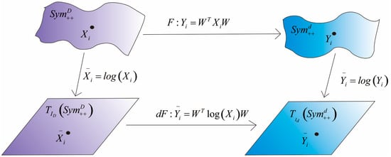 The advantage of the DR method based on tangent spaces of SPD manifolds proposed in this paper is that the DR between SPD manifolds is realized by the DR between Euclidean tangent spaces. A brief schematic diagram of the DR process is shown in Figure 1.