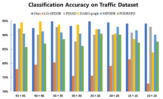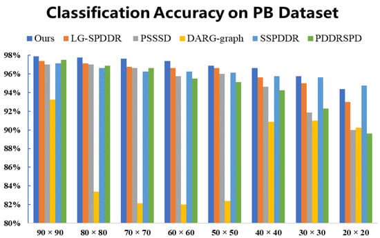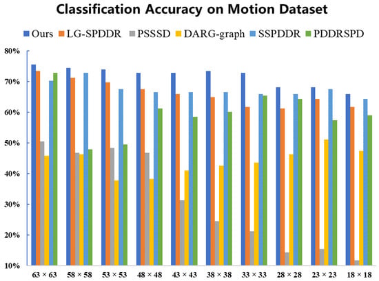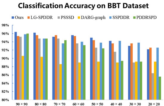 It can be seen, form Figure 15, that, under each dimension selected, the classification accuracy of RMTSISOM-SPDDR is generally higher than that of the comparison algorithms and remains at a high level (above 80%). When RMTSISOM-SPDDR reduces the original dimension to different target dimensions, the fluctuation of classification accuracy is relatively small and the dimension can be reduced as much as possible without losing performance. Comparatively speaking, the results of DARG-graph and SSPDDR fluctuate greatly, which means there is a trade-off between classification accuracy and target dimension.