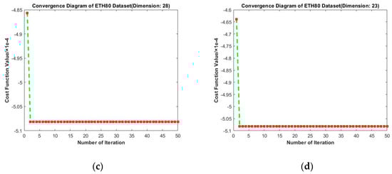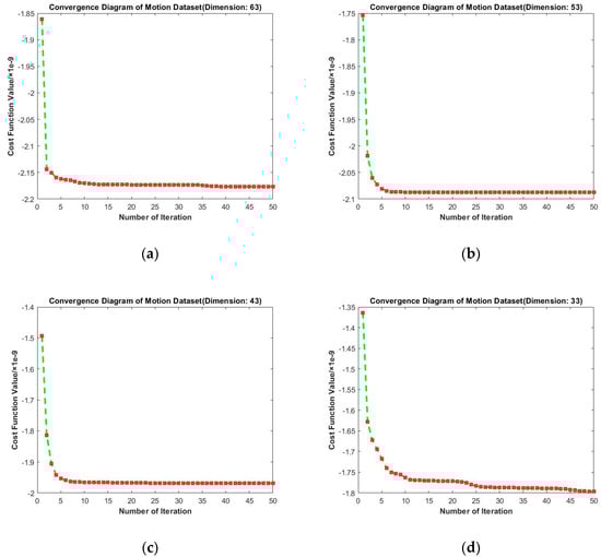 Convergence diagrams on the ETH80 dataset. The horizontal axis represents the number of iterations and the vertical axis represents the value of the loss function. (a–d) represent the results under different target dimensions (38, 33, 28, and 23) respectively.