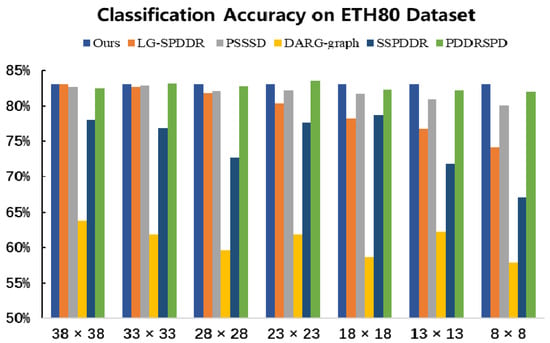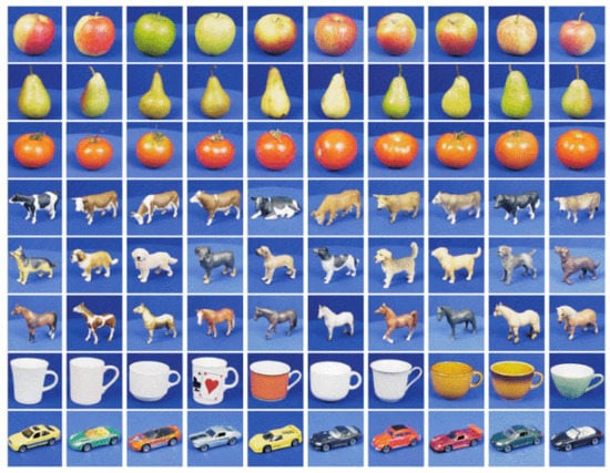 ETH-80 is a benchmark image set for recognition [43]. It covers eight categories (cars, cups, horses, dogs, cows, tomatoes, peas, apples). One category is comprised of ten objects, each of which consists of 41 pictures taken from different angles of an object, adjusted to 43 × 43 pixels. As shown in Figure 14, objects of the same category are different in terms of physical attributes, such as visual angle, color, texture distribution and shape. For this dataset, we made it into SPD data according to [24]. Specifically, let be the mean image of the image set, , where is the number of images in the image set, is the image in the image set. Then, the SPD data corresponding to the image set can be calculated by . Further, we added a correction term to so as to guarantee its positive definiteness, that is, , . Each image set corresponds to an SPD matrix. In the experiment, we evenly divided image sets to training sets and test sets with the ratio of 1:1.