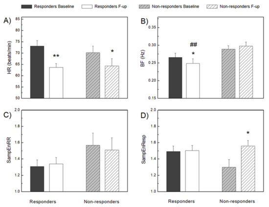 Cardiac and respiratory signal analysis parameters in CRT responders and non-responders, before (baseline) and after (follow-up) device implantation. Heart rate—HR (A), breathing frequency—BF (B), sample entropy of RR interval series—SampEnRR (C), and sample entropy of respiratory signal time series—SampEnResp (D). ** p < 0.01, * p < 0.05 intragroup comparison (F-up vs. Baseline), ## p < 0.01 intergroup comparison (Responders F-up vs. Non-responders F-up). Values are mean + standard error.