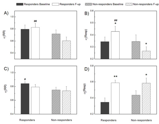 Cardiac and respiratory signal parameters obtained by detrended fluctuation analysis in CRT responders and non-responders, before (baseline) and after (follow-up) device implantation. Short-term scaling exponent of RR interval series—α1(RR) (A), short-term scaling exponent of respiratory signal series—α1(Resp) (B), long-term scaling exponent of RR interval series—α2(RR) (C), and long-term scaling exponent of respiratory signal series—α2(Resp) (D). ** p < 0.01, * p < 0.05 intragroup comparisons (F-up vs. Baseline), ## p < 0.01 Responders F-up vs. Non-responders F-up, # p < 0.05 Responders Baseline vs. Non-responders Baseline, intergroup comparisons. Values are mean + standard error.