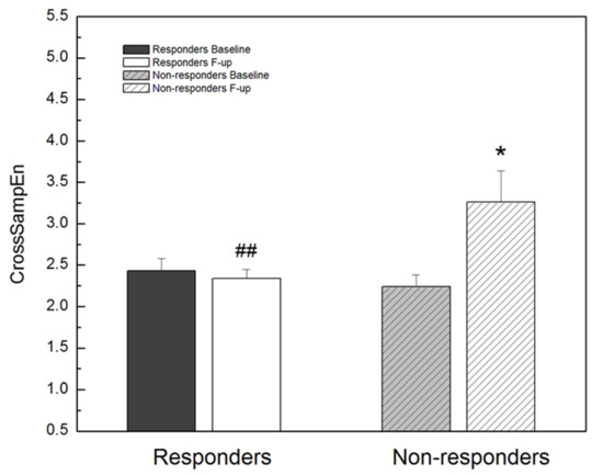 Cross sample entropy between RR interval series and respiratory signal series (CrossSampEn) in CRT responders and non-responders, before (baseline) and after (follow-up) device implantation. * p < 0.05 F-up vs. Baseline, ## p < 0.01 Responders F-up vs. Non-responders F-up. Values are mean + standard error.