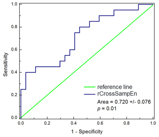 Further, we calculated the ROC curve values for the ratio (rCrossSampEn) defined as the quotient of CrossSampEn obtained for follow-up and baseline measurements (Figure 4). According to the characterization of ROC curves, our result of the area under the ROC curve belongs to the fair category and rCrossSampEn was not as strong a discriminator as we expected, but this result may indicate the direction for application of similar parameters in further studies.