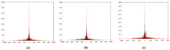 Figure 2 shows the distribution of several high frequency subbands from stereo videos encoded with different QPs. Specifically, (a), (b) and (c) represent high frequency subbands generated from encoded video with QP of 32, 38 and 44. Obviously, with the increase in QP, the coding distortion will be aggravated, which will lead to the quality degradation. Meanwhile, for a certain encoded video, TVJD generated high frequency subbands in different levels, which are denoted by different colors. By observing Figure 2, firstly, all high frequency subbands follow a similar distribution, which means that the same feature extraction can be adopted for all high frequency subband. Then, with the gradual increase in video compression, the distribution of high frequency subband changes regularly, that is, peak raised and tail suppressed. For analysis, due to the increase in compression, detail information in the video scene will be lost, resulting in more 0 values of the coefficients in the motion information subband, which is expressed as the peak rise in histogram. Consequently, to reflect the distortion degree, we can quantify the loss of scene information by calculating its histogram kurtosis. Let KMF (m) and KMR (m) denote the kurtosis feature of MFJI and MRJI in m-th sGoF. Detail calculation can be expressed as