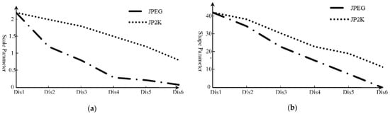 Specifically, the scale parameter η represents the width of the distribution and can reflect the local contrast. The change of local contrast will affect the perception of human eyes on quality. At the same time, the shape parameter β refers to the kurtosis of the distribution, which is sensitive to the local edge. In order to further explain the relationship between the parameters and distortion, we encoded the same image with JPEG and JP2K in different compression degrees, and extracted the corresponding parameters of each compressed image. Figure 4a,b illustrate the tendency of parameters with different distortion degrees. In detail, Dis1 to Dis6 in horizontal axis represent six compressed images with different distortion degrees, and the vertical axes denote the value of scale or shape parameter of each distorted image, respectively. As can be seen from the Figure 4, with the increase in distortion degree, the edge weakens and the contrast decreases. As a result, the parameters gradually decrease. It can also be concluded from the results that the parameters of the same image change regularly with the increase in distortion. In conclusion, the scale and shape parameters of Weibull distribution can be used to describe and measure distortion.
