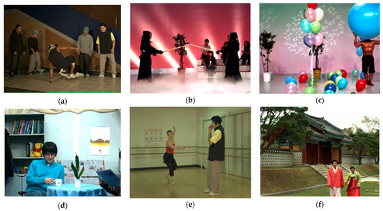First frames in left view of reference stereo videos in NBU-3DV database: (a) Break dancer; (b) Kendo; (c) Balloons; (d) Newspaper; (e) Ballet; (f) Lovebird1.