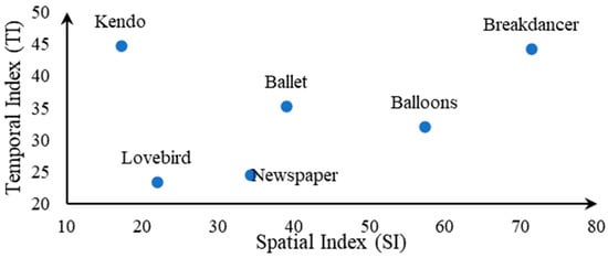 In construction of the database, firstly, we select six pairs of undistorted stereo video as reference videos, which are all publicly available standard stereo video for encoding test. The reference videos have HD or full HD resolution with a YUV 420 format in .avi containers of a 10-s time duration. In Figure 5, first frames in left view of reference stereo videos in NBU-3DV database are illustrated. In order to comprehensively and accurately test SVQMs’ performance for all types of videos, we fully considered the intensity of video motion and the complexity of scene information in sequence selection. In Figure 6, the SI and TI scatter plots of all reference videos in NBU-3DV are given, which are calculated by averaging the SI and TI of left and right view, respectively. Obviously, the points’ distribution in Figure 6 is scattered, which proves the rationality of reference video selection in NBU-3DV database.