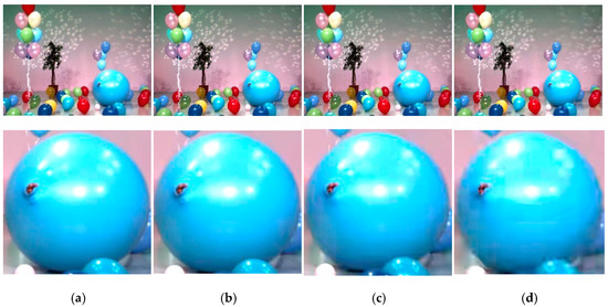 As for distorted video generation, we use HEVC [28,29] to encode the reference stereo videos. This distorted stereo video generation method is mainly based on two considerations. Firstly, with the increase in resolution, the efficient compression of stereo video is highly demanded. Meanwhile, HEVC is the most commonly used encoding standard for stereo video. In detail implementation, by changing the reference direction (intra coding/random access) and QP (QP = 26/32/38/44), a total number of 48 pairs of stereo videos with different distortion degrees can be obtained (6 reference videos × 2 reference direction × 4 QPs = 48 distorted videos). In the subjective experiment, 20 subjects were selected to watch the distorted stereo video and scored. Specifically, 20 subjects were asked to watch the test stereo videos. For stereo video display, Samsung 3DTV (model number: UA65F9000) was chosen for stereo display. In detail, we played the test video in 3D mode of the TV, and the viewer watched through electronic 3D glasses with a TV adapter. Meanwhile, the Absolute Category Rating with Hidden Reference (ACR-HR) on five discrete scores has been performed as the subjective scoring method. Similar with NAMA3D database, a MOS value with a range of 1 to 5 is used to represent the quality of distorted stereo video. For better illustration, the distorted stereo video in NBU-3DV database, Figure 7 provides the frames in distorted stereo videos encoded with different QPs and corresponding MOS scores obtained from subjective evaluation. Meanwhile, we have enlarged the region where the balloon is located in the image, so that distortion degree of different videos can be easily seen.