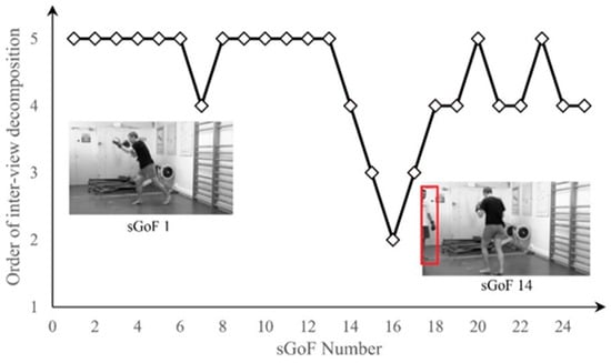 As previous mentioned, temporal correlation is stronger than intra-view correlation for most stereo video. Hence, it can be seen from Figure 8 that intra-view decomposition is usually performed after temporal decomposition in some of the earlier sGoFs. However, from sGoF 14 to sGoF 19, the priority of intra-view decomposition is continuously improved. In order to better illustrate and analyze such changes, the first frames in the left view of sGoF 1 and sGoF 14 are shown in Figure 8. It can be found that only one person moves in sGoF 1, and the motion intensity is not severe. Hence, the temporal correlation is stronger than intra-view correlation. Consequently, the structure of 4T + V is selected by TVJD, that is, the inter-view decomposition is implemented after all temporal decomposition. However, from sGoF 14, a second person appears, and the moving intensity has been greatly increased compared with that before. Therefore, from this sGoF, the temporal correlation gradually decreases, and the intra-view correlation gradually exceeds the temporal correlation. As for the optimal decomposition structure, the order of inter-view decomposition gradually advanced, and the structure of 2T + V + 2T or 3T + V + T are chosen. Through the above experimental results and analysis, it can be concluded that TVJD can adaptively construct the optimal decomposition structure according to correlation in two directions and lay a good foundation for feature extraction and quality evaluation.