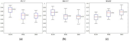 Boxplots of performance indicators of MDA-SVQM in NAMA3D database: (a) PLCC; (b) SROCC; (c) RMSE.