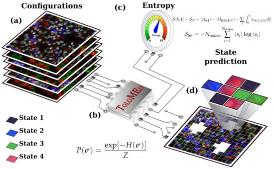 Sketch of the ToloMEo protocol. (a) ToloMEo requires in input a set of configurations of the real system. The input data must be provided as a network with nodes that can assume a discrete number of states and a connectivity matrix specifying the topological connections between the nodes. In the sketch, configurations are 2D images of cell populations, with cells colored with different fluorescence dyes. The image is divided into a 2D uniform grid. Each point in the grid is a node; the color of the image in each node represents the state, while the connectivity matrix is a near-neighbor 2D lattice. (b) ToloMEo takes as input the set of configurations and returns the maximum entropy probability distribution, P, that better reproduces a set of chosen observables. (c) Starting from the optimiization path, the MaxEnt entropy, S, can be evaluated using Equation (12). (d) The obtained probability distribution can be used to generate novel configurations and to predict the spatial disposition of some states, keeping fixed the others.
