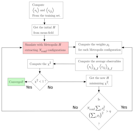 Flowchart of the ToloMEo algorithm. The red cell, namely the Metropolis simulation of Hamiltonian, H, is the most computationally expensive part of the calculation, while, in comparison, all the other procedures are almost instantaneous. For this reason, the overall computational cost of the algorithm depends only on the number of times the flowchart passes through that cell.