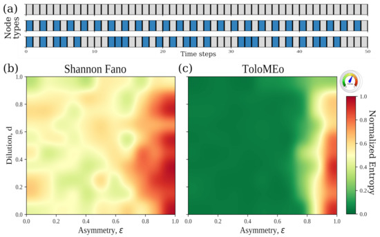 Entropy of the Hopfield neural network. (a) Examples of possible single neuron activation profiles. From top to bottom: always active neuron, oscillating neuron with period one, chaotic neuron. (b) Mean MaxEnt normalised entropy obtained as a function of the network asymmetry, and ailution, d for a Hopfield network of 20 nodes obtained in the Shannon–Fano approximation. Averages are performed over 10 independent realizations of the Hopfield dynamics for each couple of dilution and asymmetry parameters. (c) Same as in (b) but using the ToloMEo algorithm.