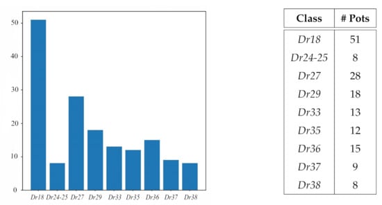 Bar chart and table detailing the number of different pots per class in our dataset. Classes are labelled starting with Dr followed by the number of the Dragendorff form they are based on [19]. The table gives the exact number of vessels per class.