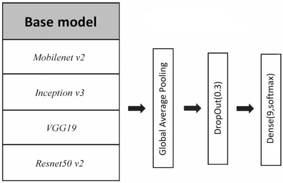Diagram of the neural nets considered in the article. Four different base architectures are considered: Mobilenet v2, Inception v3, Resnet50 v2 and VGG19. The last layers of these architectures were removed up to the convolutional structure and substituted by a Global Average Pooling layer followed by a Drop Out layer with drop probability and a final dense layer with softmax activation and 9 nodes (one for each of the 9 pot classes).