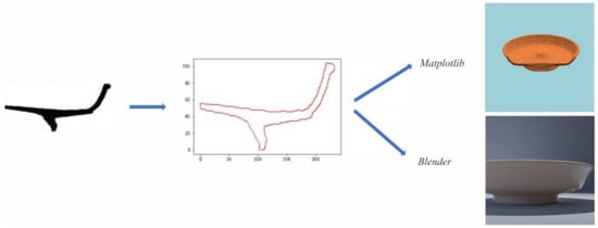 Diagram of the pot simulation. Starting from a digitized profile drawing the profile is extracted as an ordered list of points. With that profile we generated simulated photographs using the package Matplotlib or the 3D modelling tool Blender.