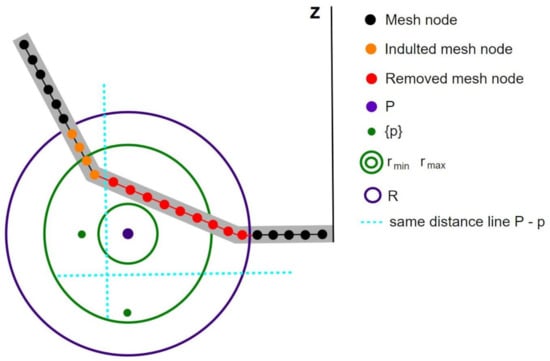 2D diagram of the breaking procedure. Mesh points that fall within radius R (purple circle) from P (purple point) are susceptible to being removed. Points (green points) are inside the crown of radii and (green circles), the lines that separate mesh points closer to than P are indicated as a dashed cyan line. Black points in the pot mesh are not susceptible to be removed; orange ones are susceptible, but have been pardoned because they are closer to a green point than to P (purple); and lastly, red ones have been removed.