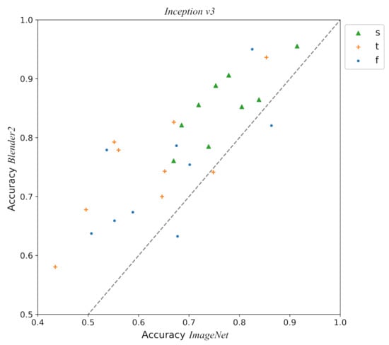 Plot detailing the accuracy of the Inception v3 model across the different viewpoints and comparing performance with Blender2 and ImageNet pre-training. Each point represents the accuracy for each pot class and viewpoint: standard (s, green triangle), zenith (t, orange cross), flipped (f, blue point). The dashed grey line shows the point where the accuracies of both pre-training regimes are the same. The fact that most of the points are well above these lines shows how pre-training with Blender2 improves the performance in general. Notice also that the standard view shows generally a better performance in both models in comparison with the zenith and flipped views.