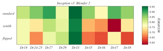 A comparison between the difference in performance per viewpoint of Inception v3 with Blender2 and ImageNet pre-trainings is shown in Figure 11. Improvement in accuracy seems to have a similar intensity for all viewpoints. This global shift seems to be constant for the whole ImageNet accuracy range. Finally, a comparison of the accuracy per pot class and view for the best model Inception v3 with Blender2 pre-training can be found in Figure 12.
