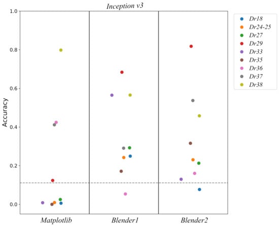 In Figure 13 accuracies for the different pot classes are shown for each simulated dataset and architecture. As we can see there are huge differences in the performance of Matplotlib and Blender datasets. This is to be expected as the quality of the images using Blender was improved substantially, see Figure 8. It is also interesting to notice the huge variability per pot class and, how some profiles always have a good performance such as Dr38, while others like Dr18 usually have poor results, though the latter is perhaps not very surprising as this concerns a class into which multiple types have been amalgamated, potentially making it more difficult for the classifier to extract distinguishing features. An aggregated comparison can be found in Table 8 for Inception v3 model, where we can see that Blender datasets outperform Matplotlib.